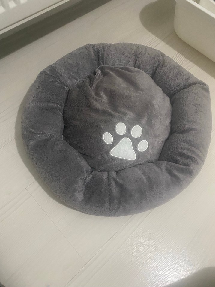 Yumuşak gri kumaştan yapılmış, pati desenli kedi yatağı, evcil hayvanınız için rahat bir dinlenme alanı sağlar . Tertemizdirr