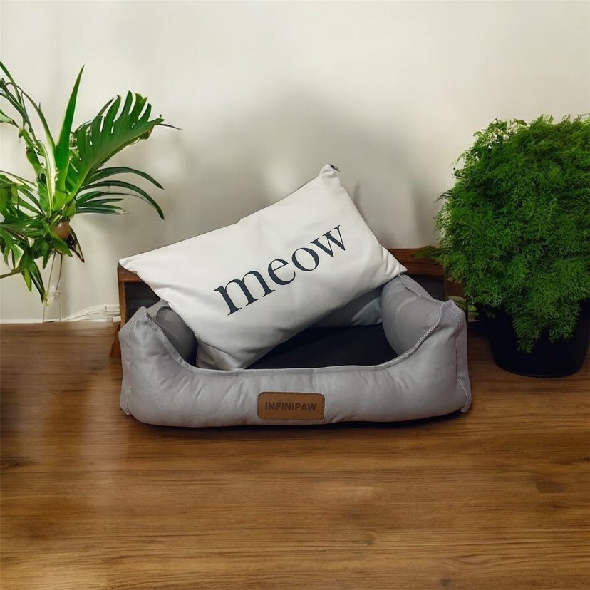 Gri renkte, 'meow' yazılı yumuşak yastıklı INFINIPAW marka kedi yatağı. Konforlu ve rahat kullanıma uygundur. Ürün Özellikleri: • ✔️ 60 x 40 cm ölçüler • ✔️ Yıkanabilir kumaş – kolay temizlik • ✔️ Tırmıklara karşı dayanıklı özel kumaş • ✔️ Pati dostu, yumuşak ve rahat yapı • ✔️ Çift taraflı kullanım: Yastığın ön ve arka yüzü aynı desen ve renktedir • ✔️ Özel tasarım, piyasadaki standart ürünlerden farklı Hem şık hem konforlu bir uyku alanı sunar. Evcil dostunuzun favori yatağı olmaya aday
