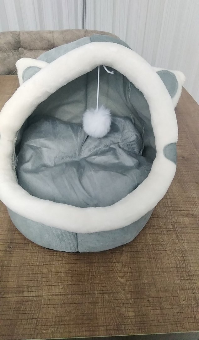 Yumuşak ve rahat gri kedi yatağı, kapaklı ve asılı beyaz ponpon oyuncaklı. Kediler için konforlu ve davetkar bir tasarım.