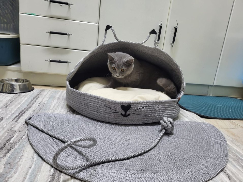 Gri renkte, yumuşak minderli kedi yatağı ve bağlı oyuncak halat ile rahat ve eğlenceli bir alan sunar .