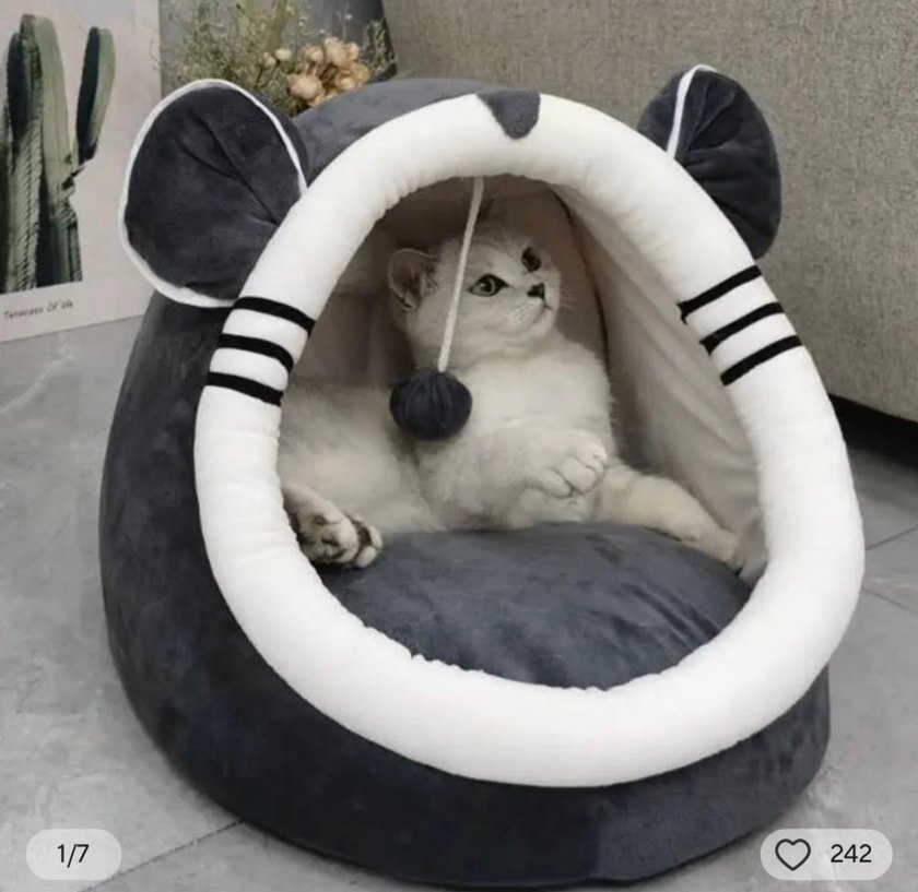 Yumuşak ve rahat gri kedi yuvası, içinde asılı top oyuncak ile oyun alanı sağlar. Kediler için konforlu dinlenme noktasıdır. İthal ,sıfır,büyük boy (XL)kedi,küçük köpek yatağı