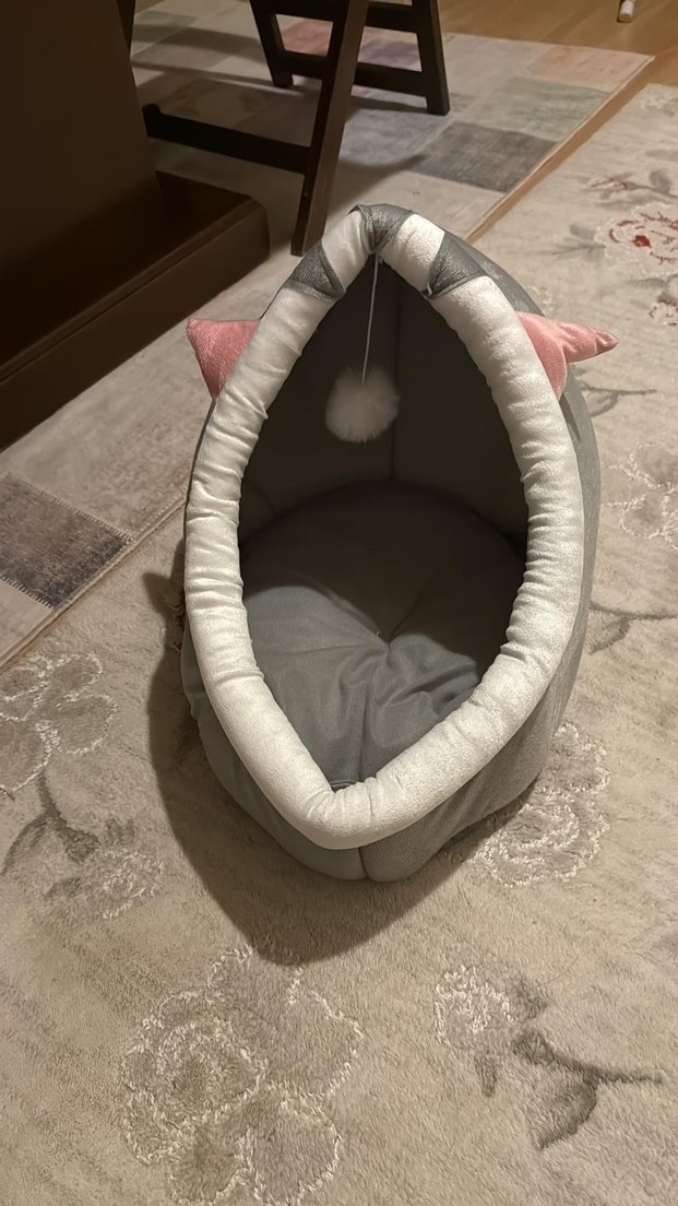 Gri renkli, yumuşak ve yastıklı iç yapıya sahip kedi yatağı. Oyuncu kulak detayları ve sarkıtmalı ponpon oyuncak içerir.