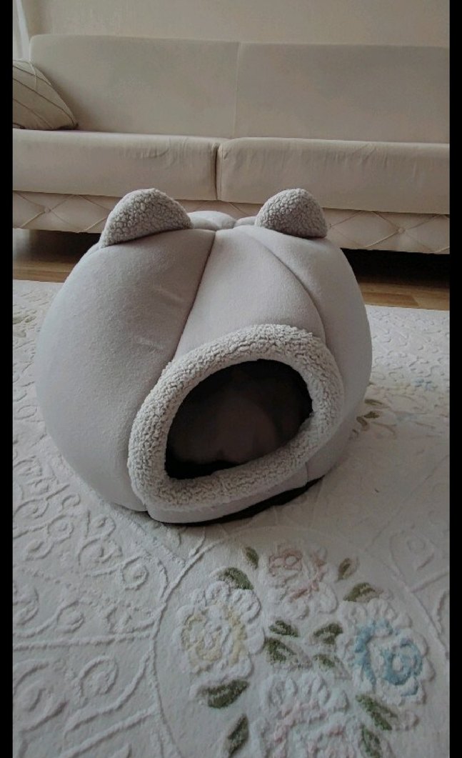 Yumuşak ve sıcak kumaştan, kulak detaylı gri kedi yatağı, kediler için rahat bir sığınak sağlar.