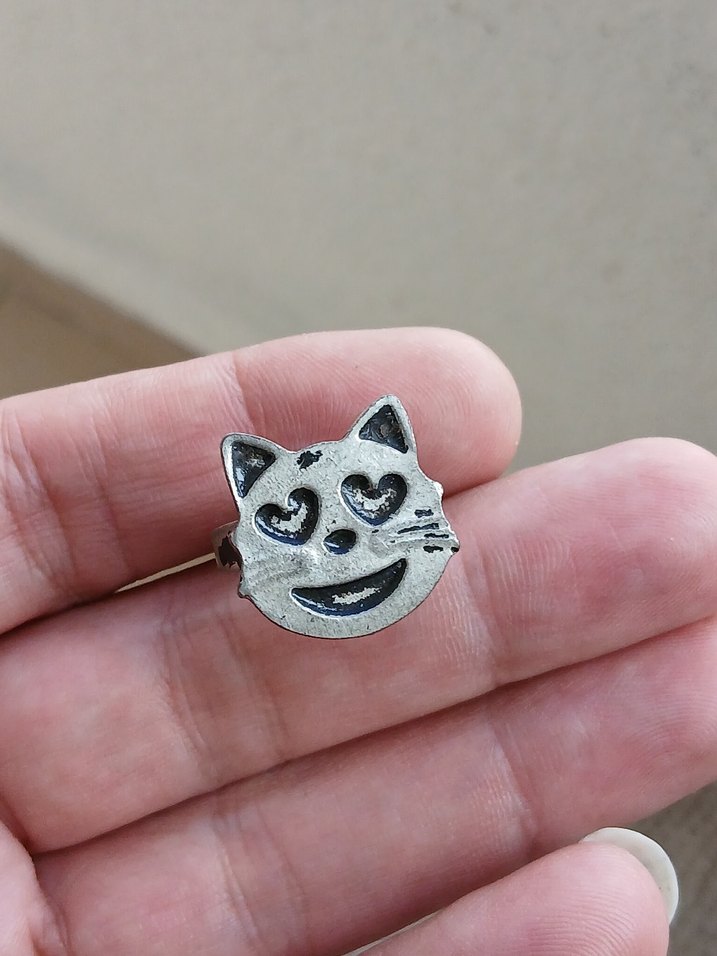 Kalp şeklinde gözleri ve gülen ifadesi olan gri kedi yüzü figürlü takı aksesuarı, dokulu bir yüzeye sahiptir.