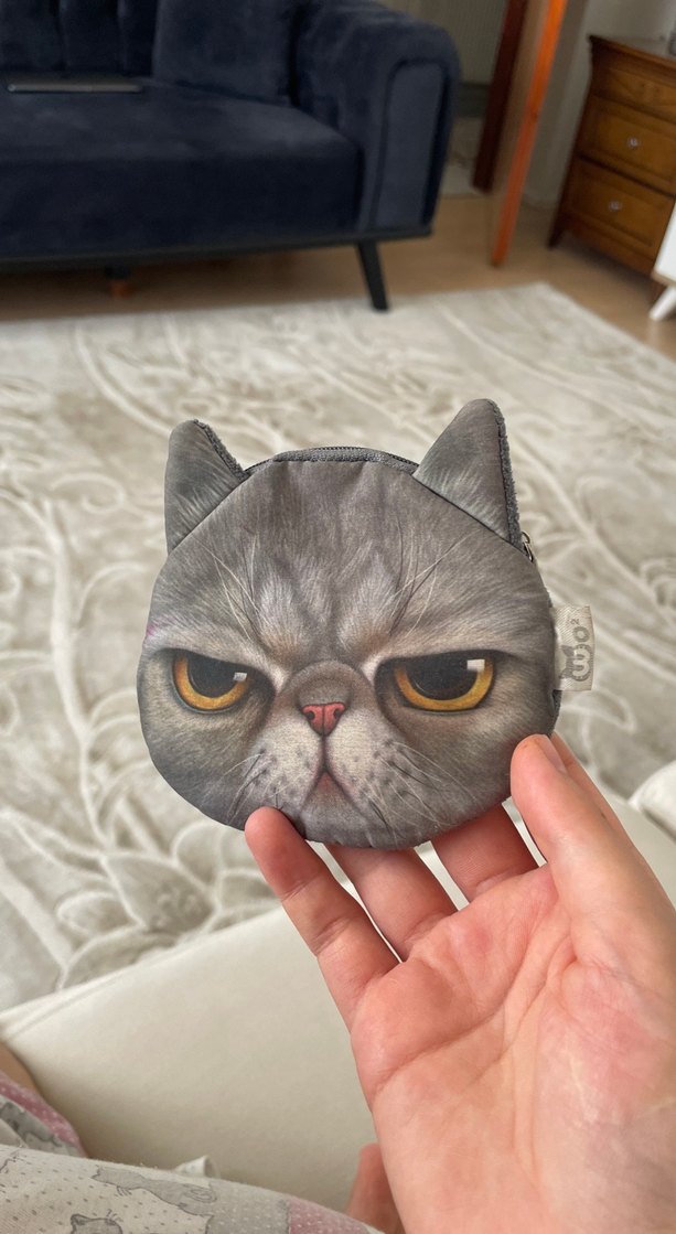 Gerçekçi gri kedi yüzü ve kulak detaylı küçük bozuk para cüzdanı, küçük eşyalar için uygun.
