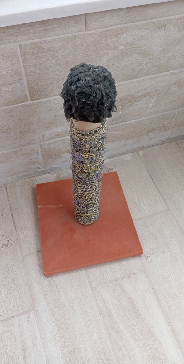 Gri renkte, dayanıklı tabanlı ve tırnak törpüleme için sarılı bir direğe sahip, üzerinde yumuşak top bulunan kedi tırmalama direği.