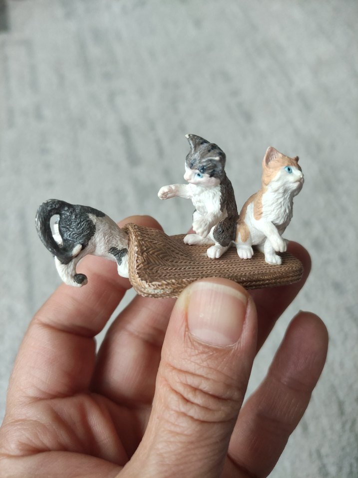 Bu dekoratif minyatür, dokulu bir taban üzerinde oturan ve duran üç gri kediyi yansıtarak oyun dolu bir anı gösteriyor.Yurtdışından alındı,yeni ürün.