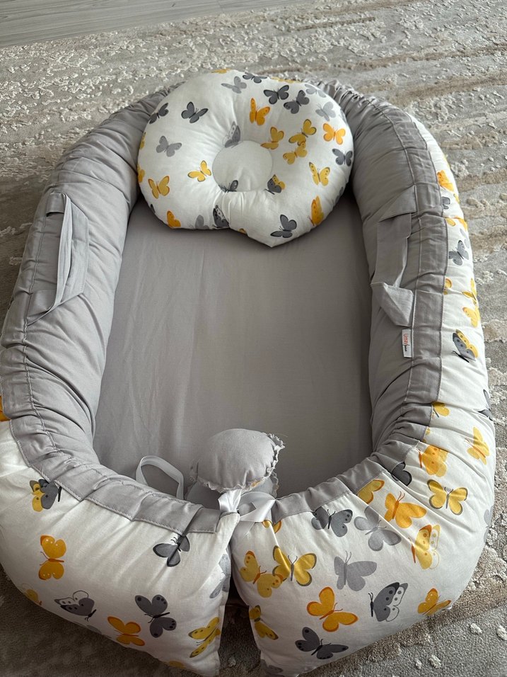 Gri kelebek desenli bebek uyku yatağı- Anne yanı taşınabilir yatak Sayılı kullanıldı temiz ve yenidir