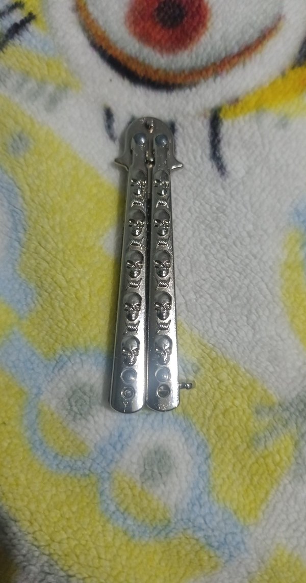 Kolu üzerinde kafatası deseni bulunan gri renk kelebek tarak. Metalik görünümü dikkat çekicidir.