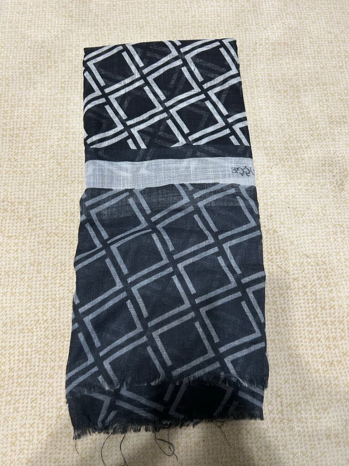 Gri geometrik desenli, kemerli kadın şalı, yumuşak tekstil kumaştan. Bohem tarzı ve rahat, avangart bir görünüm sunar.