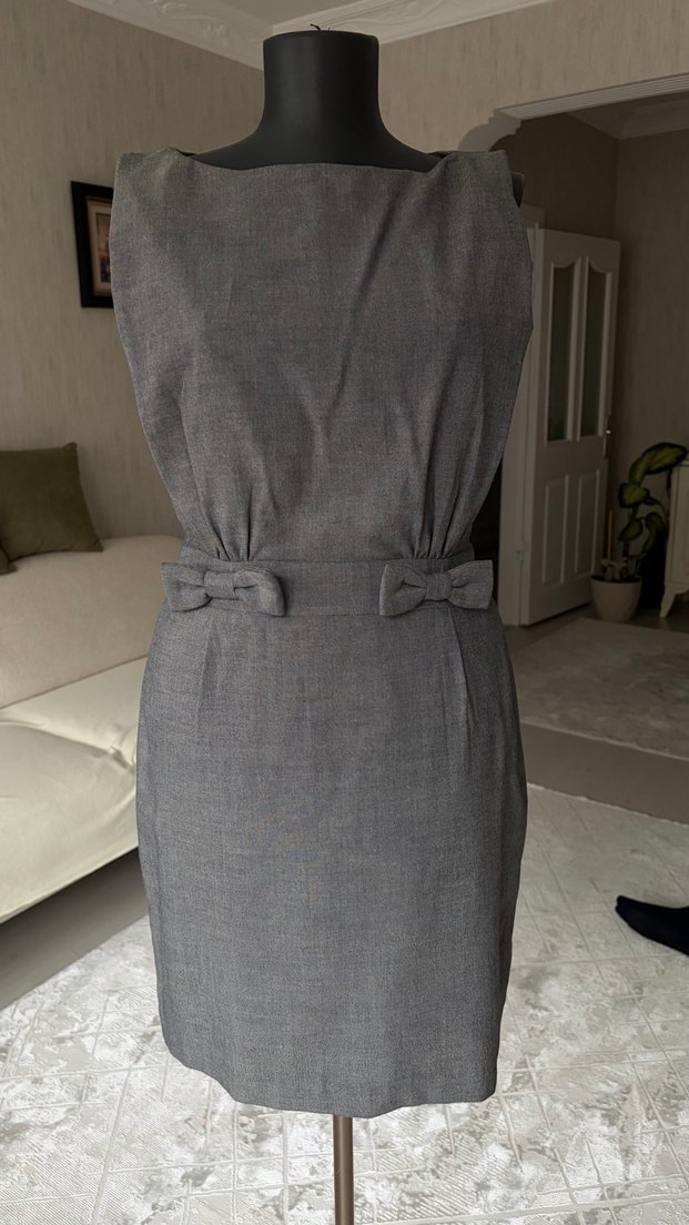 Zarif ve sade şıklığıyla öne çıkan gri tonlarda, diz boyu bir elbise. Kolsuz tasarımı ve kayık yaka formu modern bir duruş sağlarken, bel kısmındaki sabit kurdele detayları elbiseye feminen bir dokunuş katıyor. Yandan fermuarlı yapısı sayesinde rahat giyilip çıkarılabilir. Günlük şıklıkta, ofis ortamında ya da özel davetlerde zarif bir tercih olabilir.