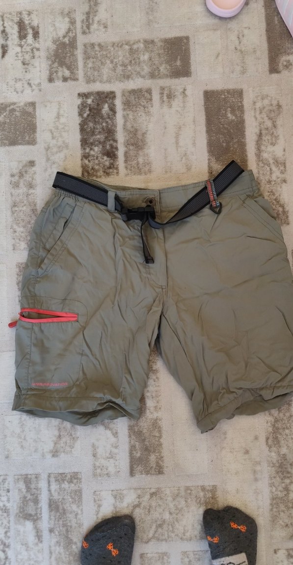 Gri tonlarında, kemerli ve bol kesim kısa erkek şort. Sentetik kumaştan üretilmiş, dış mekanlarda rahat kullanım sağlar.