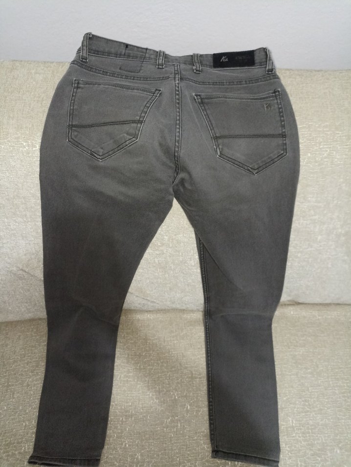 Gri renkte, kemerli ve normal kesim erkek kot pantolon. Denim kumaştan, günlük ve sokak tarzı için uygundur.