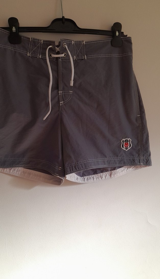 Gri renkli, kemerli ve bol kesim erkek mini şort, sade ve desen içermeyen sokak stiliyle plajda kullanıma uygun.