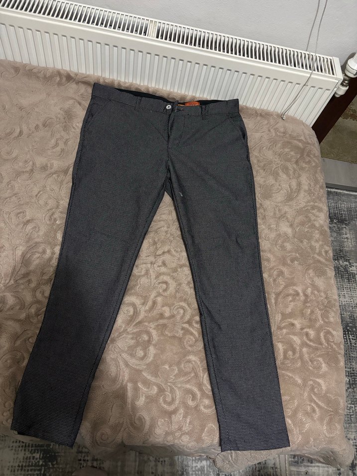 Gri renkli, kemerli bel ve regular fit kesime sahip erkek pantolonu. Sentetik kumaştan, günlük rahat sokak stili için uygun.