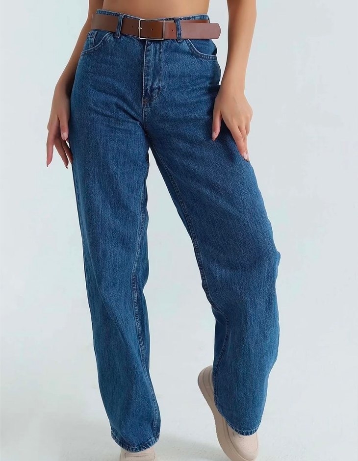 Gri Kemerli Geniş Kesim Mavi Kot Pantolon