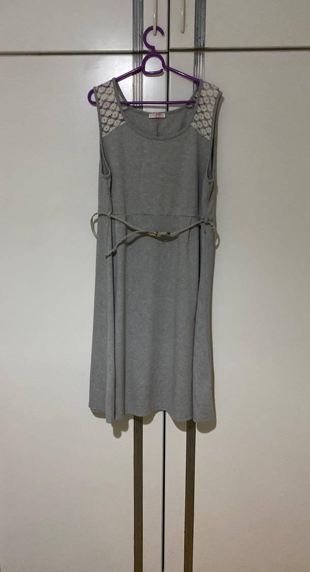 Kolsuz, yuvarlak yakalı gri hamile elbisesi. Omuzlarda dantel detayları ve belde kemer bulunur. Triko kumaştan, midi boy ve vücuda oturan kesim.