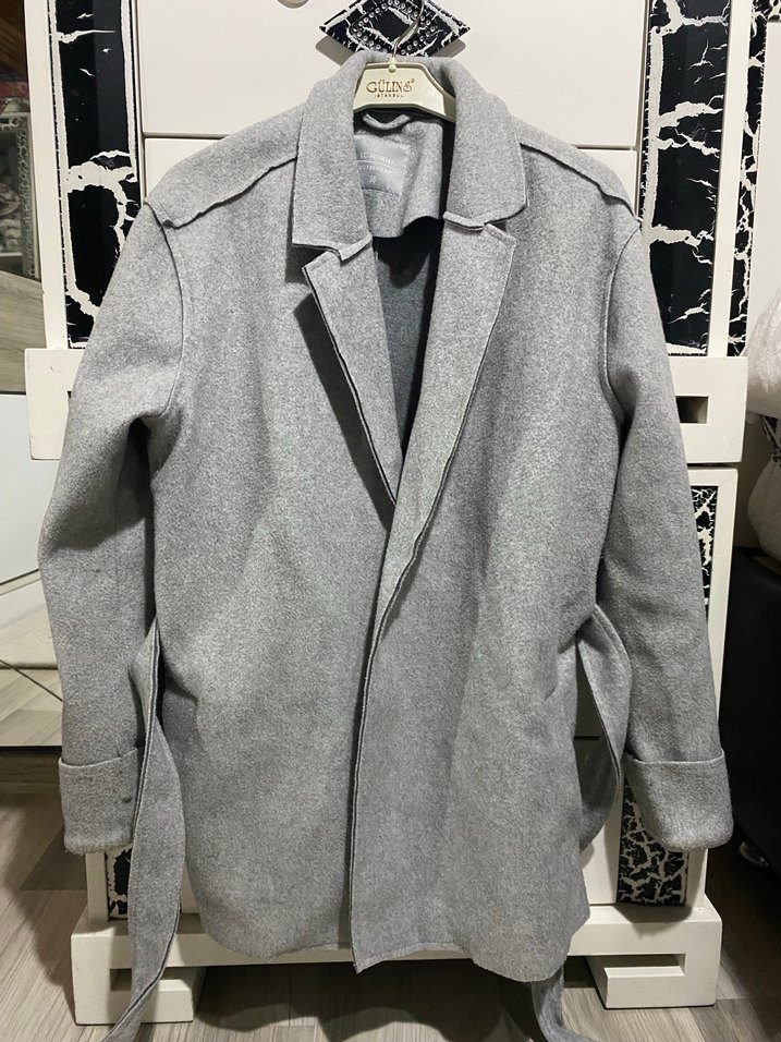Gri renkte, kemerli ve klasik yakalı, yumuşak ve sıcak kumaştan uzun kollu kaban.