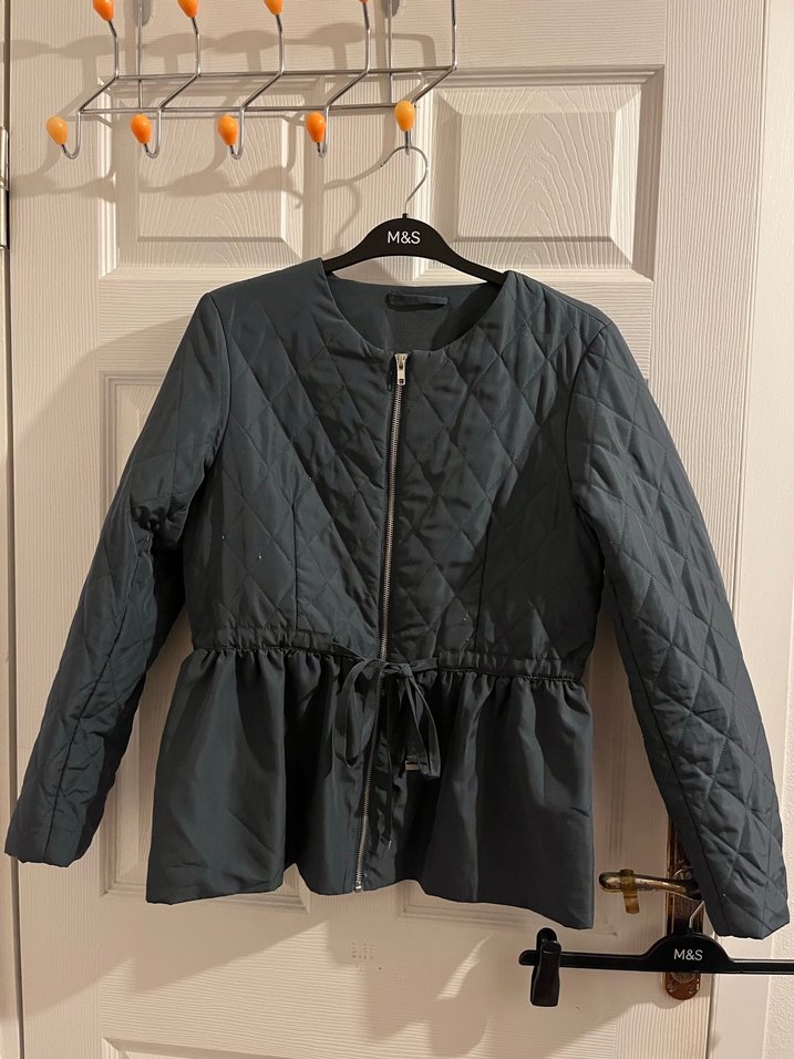 Gri renkte, kemerli ve fermuarlı kadın ceket. Uzun kollu, kapitone dokulu, Günlük kullanım için uygundur.