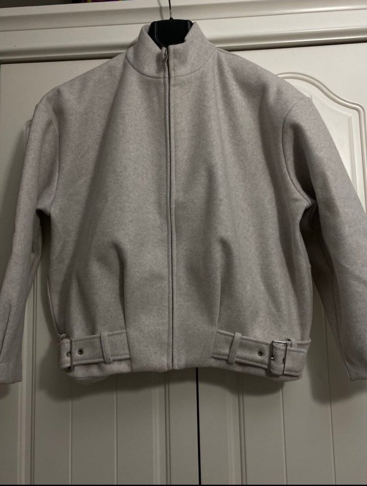 Gri renkli, kemerli ve uzun kollu kadın ceket. Minimalist tarzda, fitted kesim ve normal boyda, notched lapel yakaya sahip.
