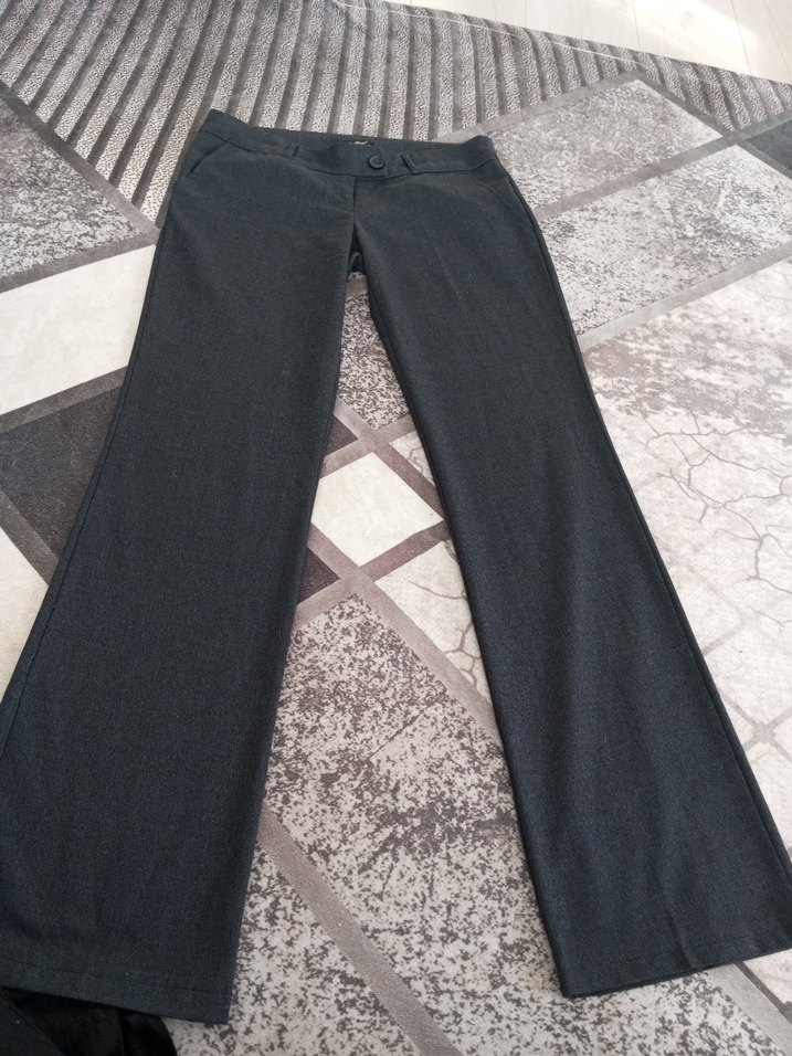 Gri renkli, kemerli ve normal boy midi kadın denim kumaş pantolon. Ofis ve günlük sokak stiline uygun, düz ve rahat kesim.