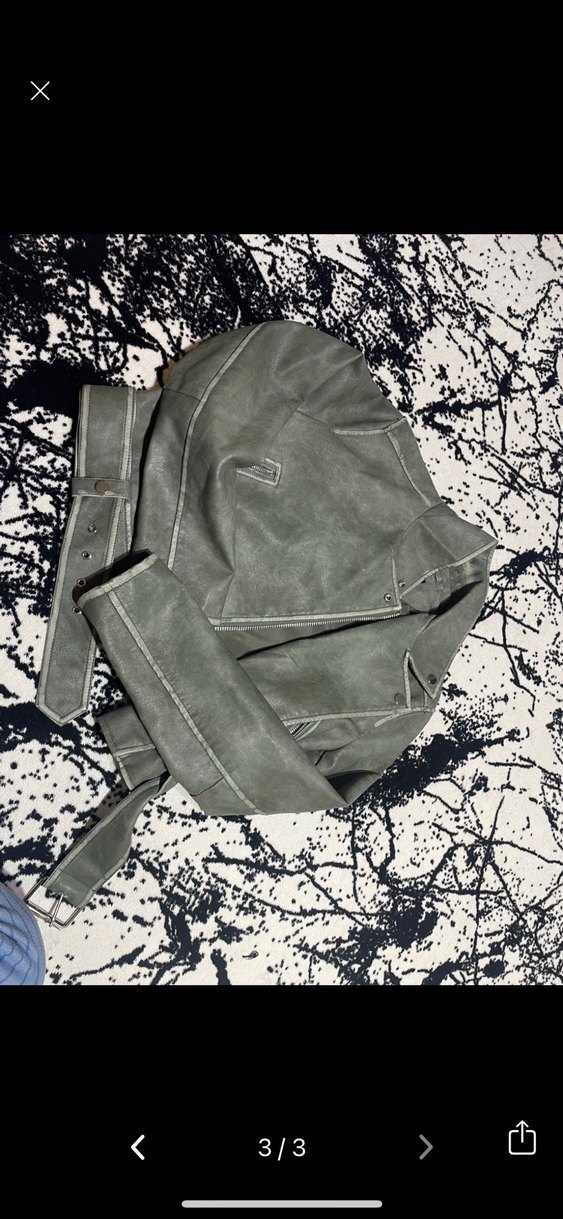 Gri deri ceket, kemerli bel, askılı kollar ve kesik yakaya sahiptir. Rahat kesimi ve midi boyu ile sokak modasına uygun, gündelik kullanıma idealdir.