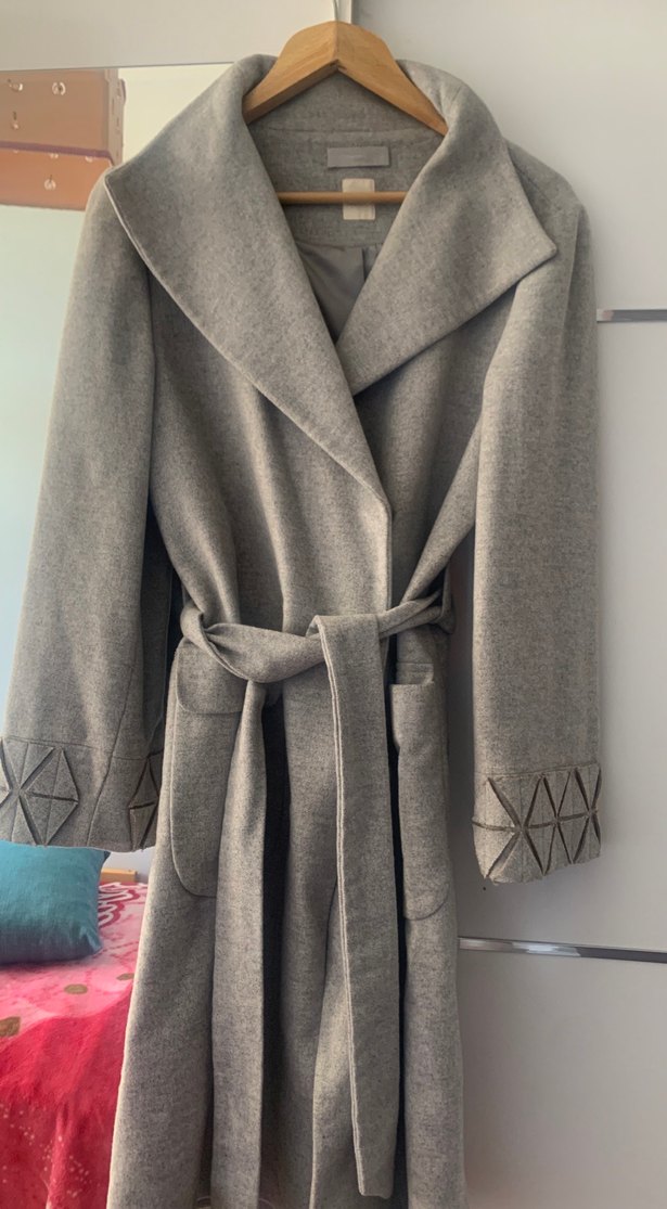Geniş yakalı, kemerli gri kadın kaban. Cepli ve kollarında dekoratif dikiş detayları bulunur. Yumuşak ve sıcak kumaştan üretilmiştir.