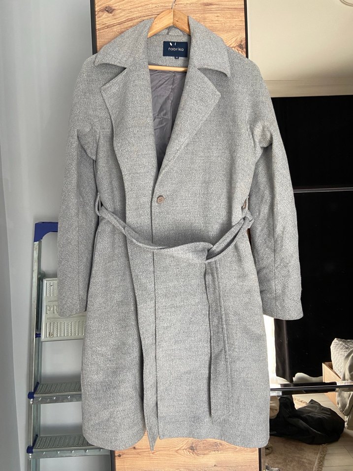 Gri renkte, kemerli ve tek düğmeli kadın kabanı. Yumuşak ve sıcak tutan kumaştan, klasik yakalı ve uzun kollu. Fabrika marka yün karışımlı sorunsuz tertemiz kaşe mont kuşaklı cepli
