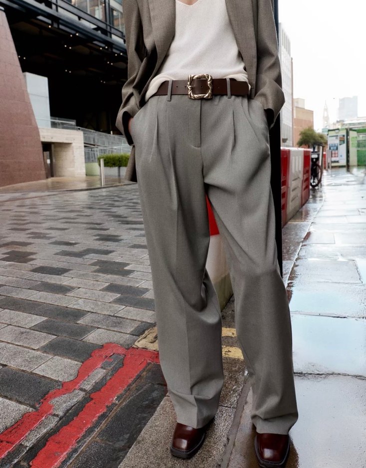 Gri midi boy, kemerli, düz desenli kumaş pantolon. Rahat kalıp ve günlük sokak stili için uygundur.