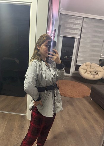 Gri keten midi gömlek, halter yaka ve uzun kollu, bel kemerli ve bol kesim. Günlük kullanıma uygun, şık ve rahat bir parça.