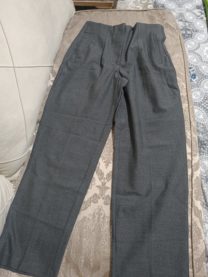 Gri keten kumaştan, kemerli ve normal boyda, rahat kesim kadın pantolon. Günlük kullanıma uygun şık tasarım.