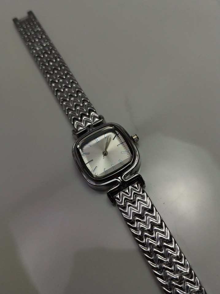 Gri kemerli metal kayışa ve kare kadrana sahip kadın kol saati, klasik ve çağdaş tarzları bir araya getirir. ⌚