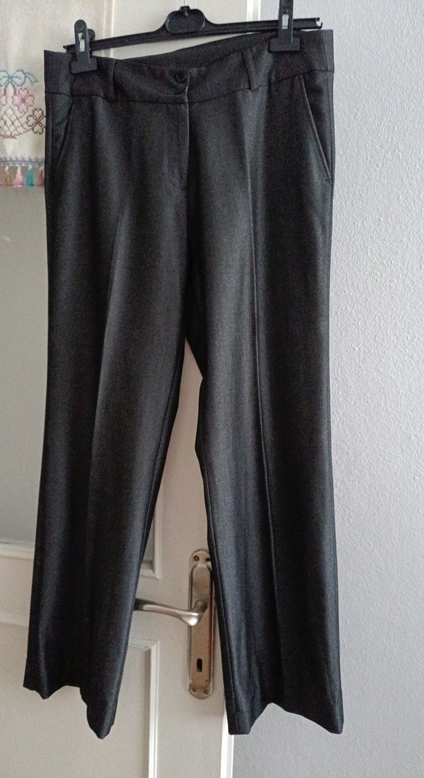 Gri renkte, kemerli ve regular fit kesime sahip kadın kumaş pantolon. Denim kumaştan üretilmiş, midi boyda ve desensiz, ofis için uygun.