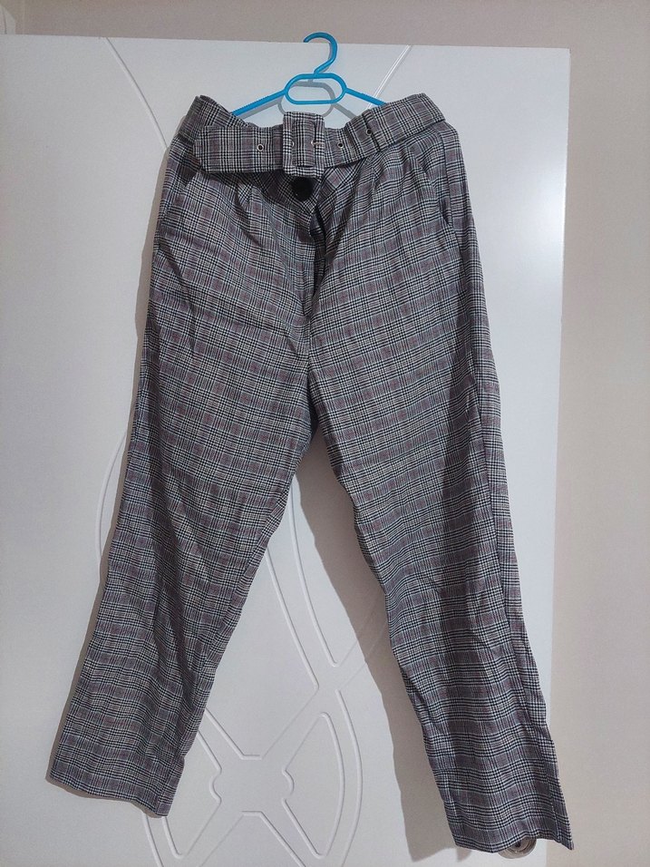 Gri renk, kemerli, normal boy midi kesim kadın kumaş pantolon. Sentetik kumaştan üretilmiş, günlük rahat kullanıma uygun. M beden