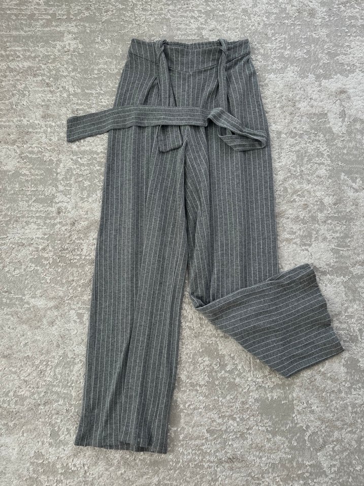 Gri renkli, kemerli, midi boy kadın kumaş pantolon. Rahat kesimi ve yumuşak sentetik kumaşıyla gündelik kullanıma uygundur. İnce çizgili, normcore tarzda.