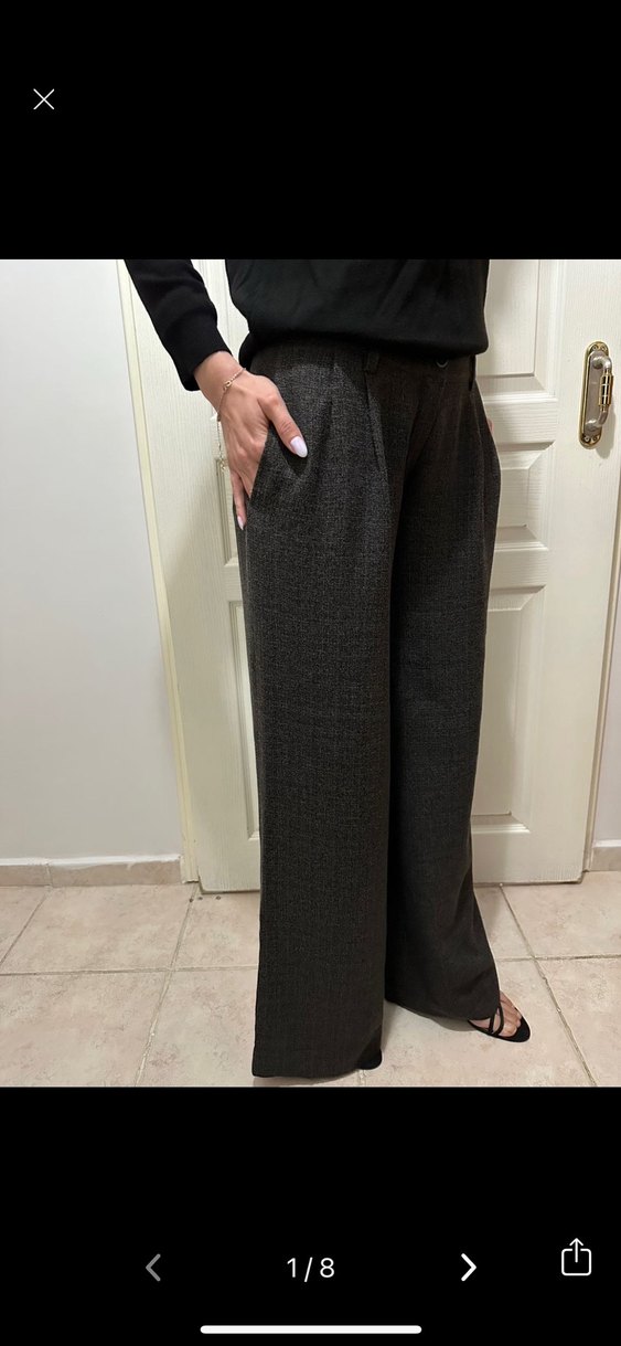 Gri renkte, kemerli, midi boy kadın kumaş pantolon. Yumuşak sentetik kumaştan, ofis için trend ve rahat bir tarz sunar. Özel dikim 1kez giyildi