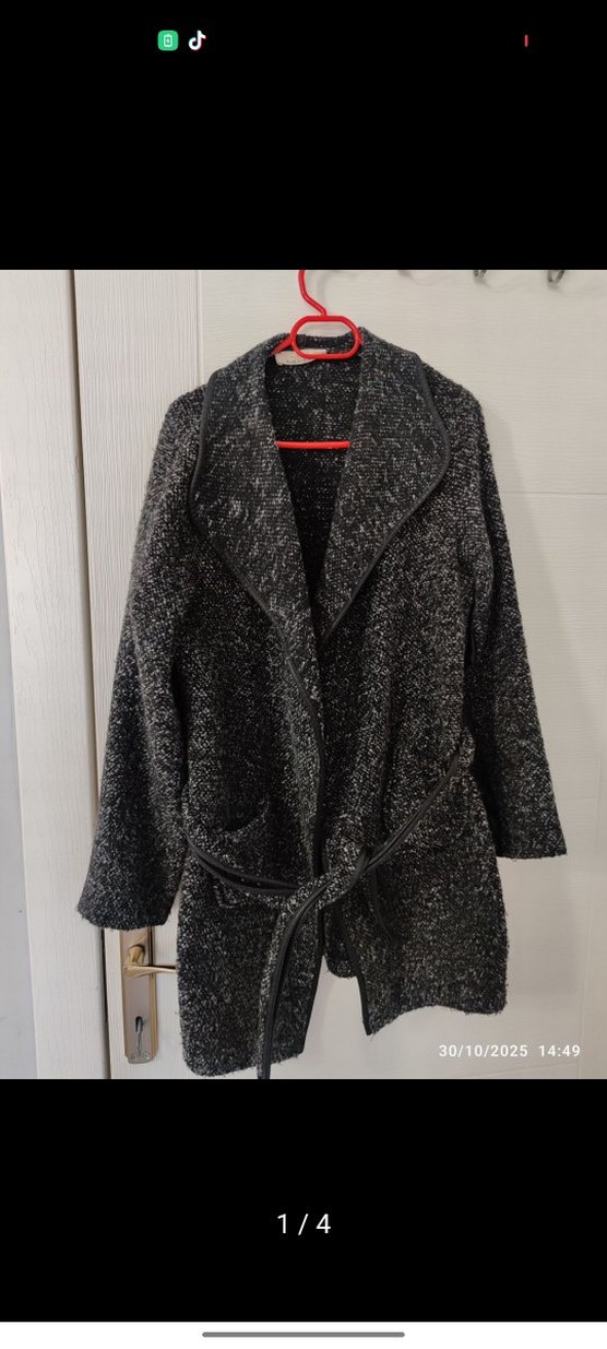 Geniş kesim, uzun kollu ve kemerli kadının midi boy yün kabanı. Notlu yakası ve gri rengiyle günlük sokak stiline uygun.