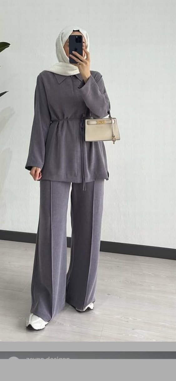 Gri renkte, kemerli ve uzun kesim kadın ofis takımıdır. Sentetik yumuşak kumaştan, yakası kesimdir ve minimalist normcore tarzındadır.