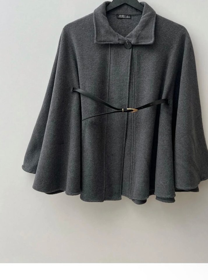 Yumuşak ve sıcak kumaştan yapılmış, yüksek yakalı kadın panço. Geniş kesim, kısa boy ve ince kemer detayıyla rahat bir sokak stili sunar. Gri ve desensiz, günlük kullanım için uygun.