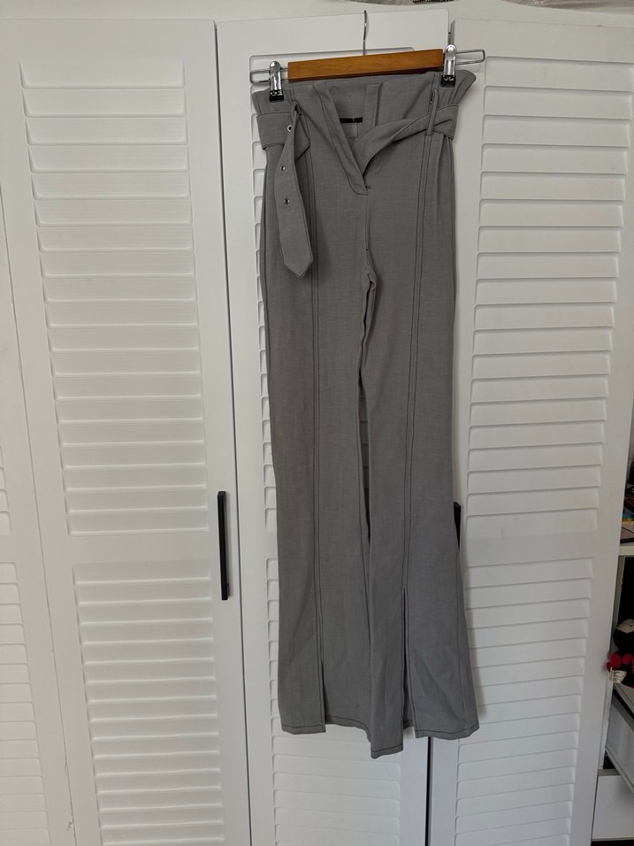Gri, kemerli ve uzun kesime sahip, minimalist tarzda, ofis için uygun kadın pantolonu. Paçaları yırtmaçlıdır.