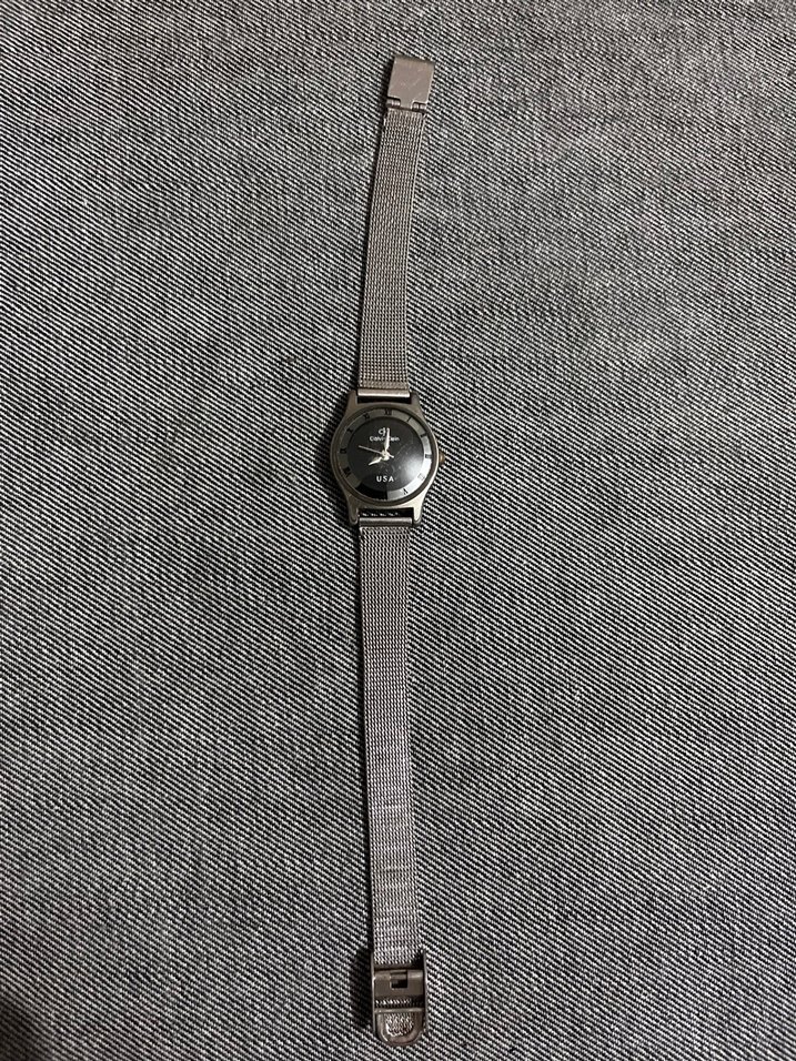Gri kemerli kayış ve yuvarlak kadrana sahip Calvin Klein kadın saati.