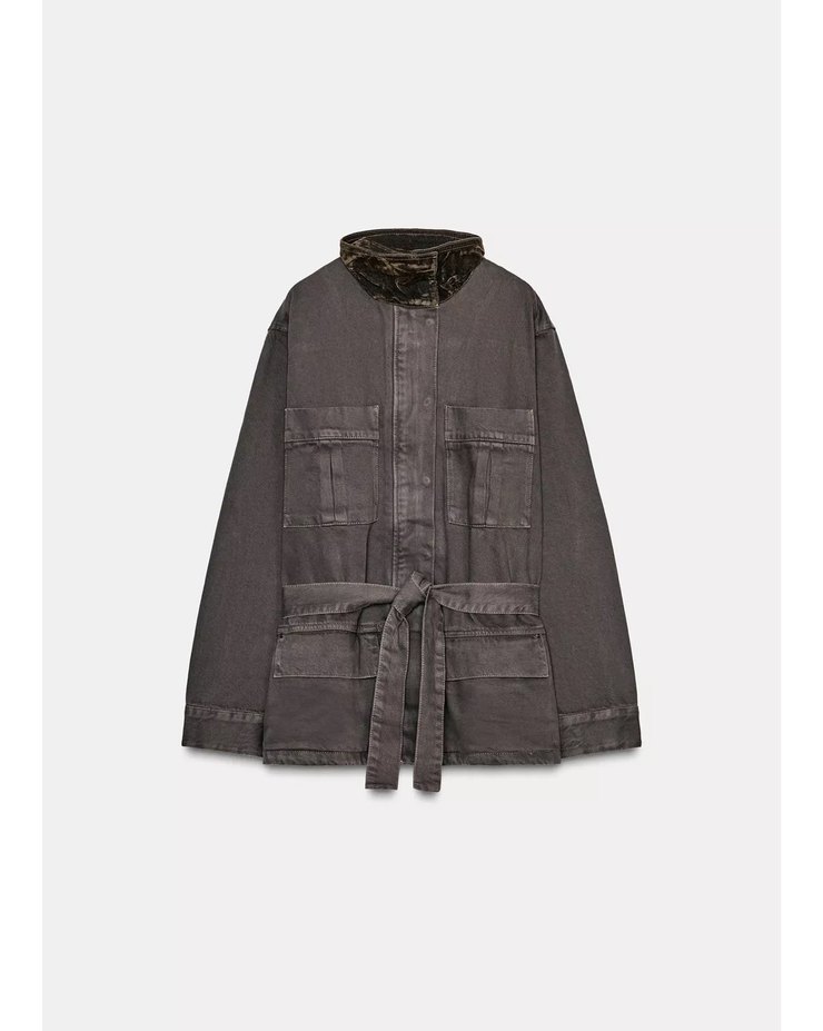 Gri kumaştan, kemerli ve yüksek yakalı kadın ceket. Uzun kollu, bol kesim, midi boy, günlük rahat kullanım için uygun.
