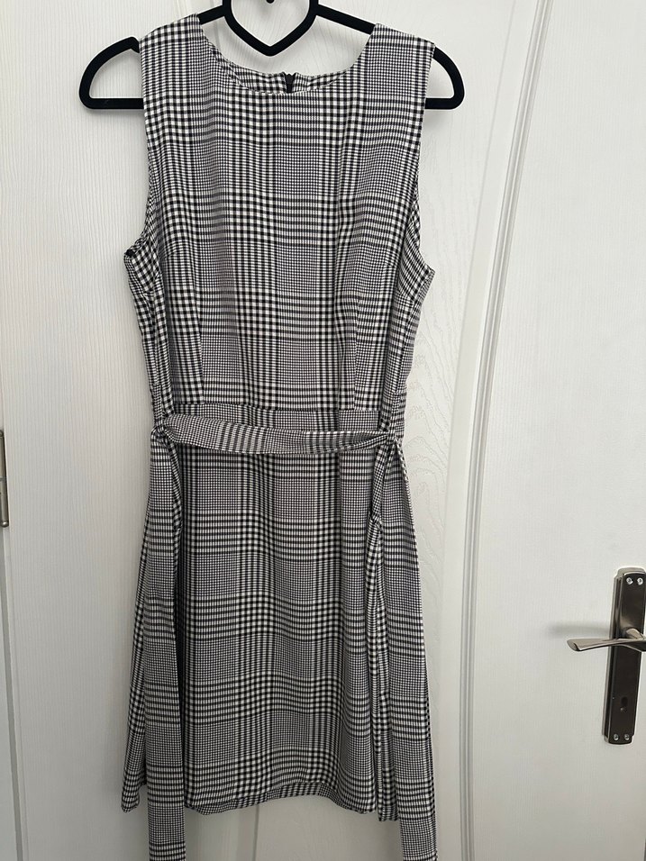 Gri kareli desenli, kemerli ve kolsuz midi elbise, yüksek yakalı ve sentetik kumaştan üretilmiştir. Günlük rahat kullanım için uygundur.