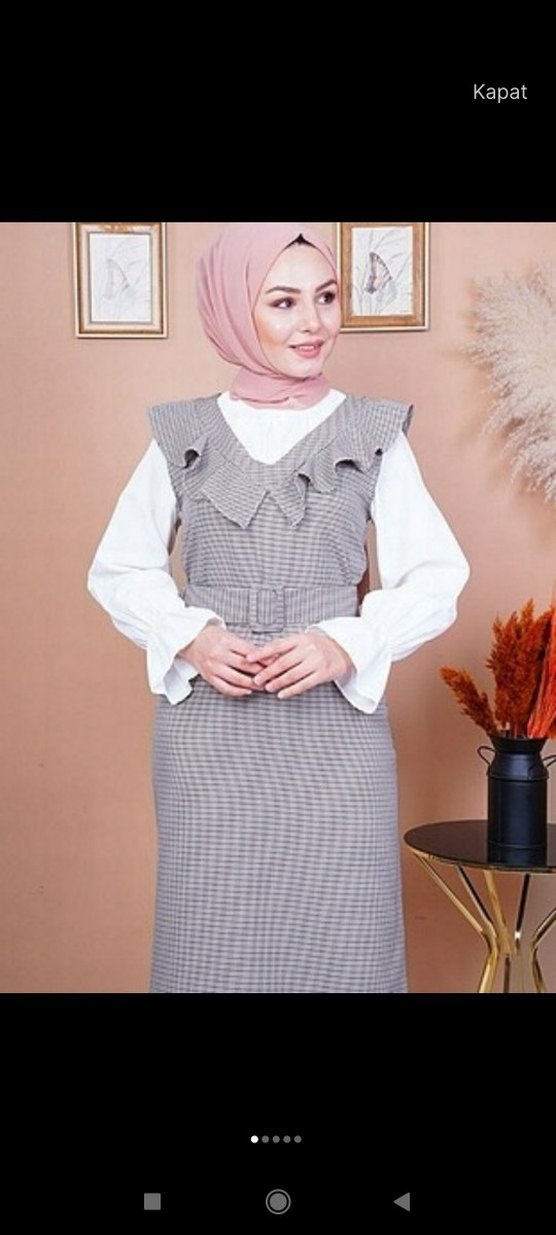 Gri kareli uzun elbise, yakalı ve kolsuz tasarımıyla kemerli detay içerir. İş ortamları için uygun, modest bir görünüm sunar.