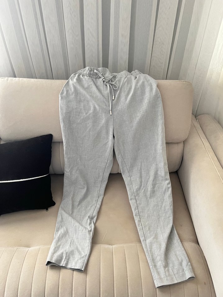 Gri keten kumaştan, kemerli, bol kesim ve midi boy kadın pantolon. Desensiz, günlük rahat kullanıma uygun.