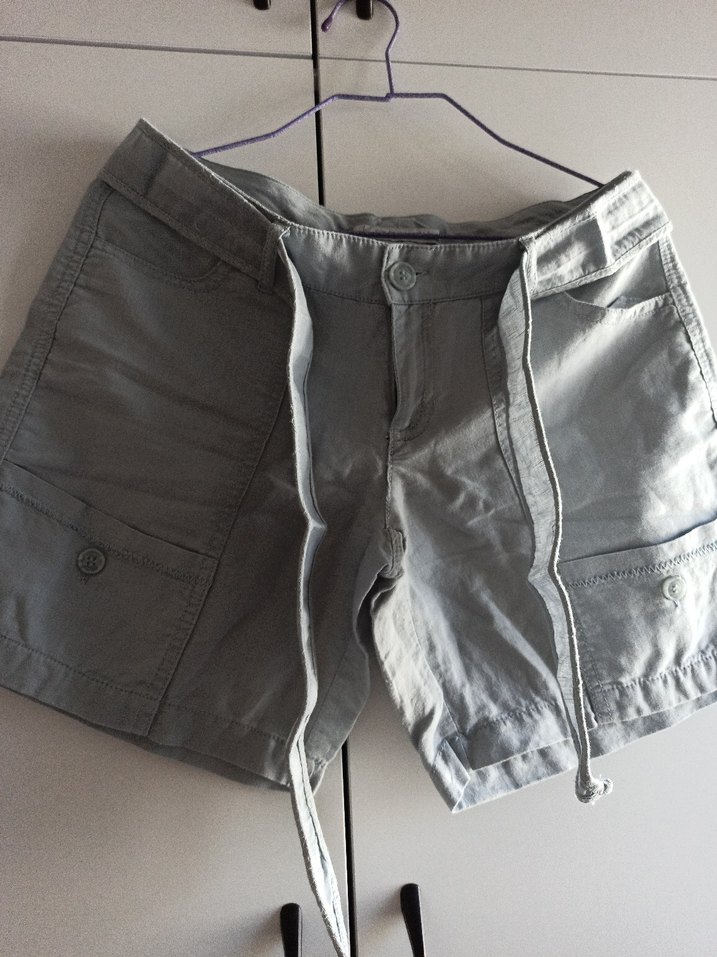 koton marka Gri keten kumaştan, kemerli ve bol kesim mini şort.. Rahat ve desen içermeyen, sokak stiline uygun dış mekan kullanımı için ideal.