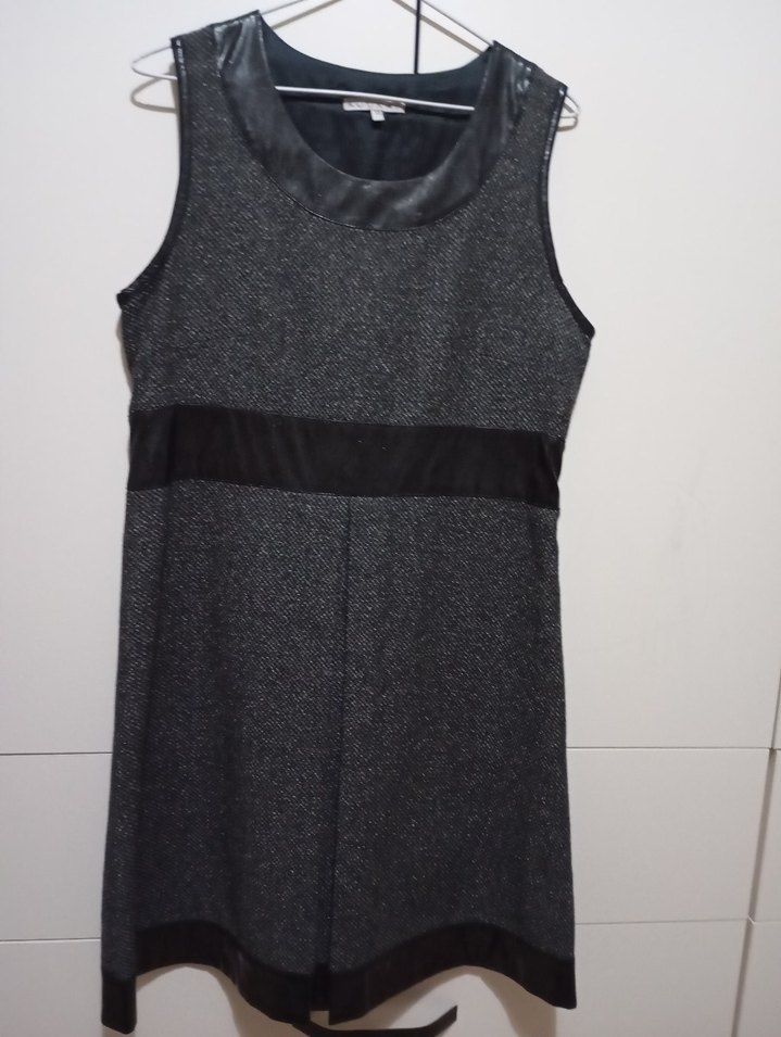 Kolsuz, kemerli ve midi boy gri elbise. Bisiklet yaka ve regular fit ile ofis ve sokak stiline uygun.