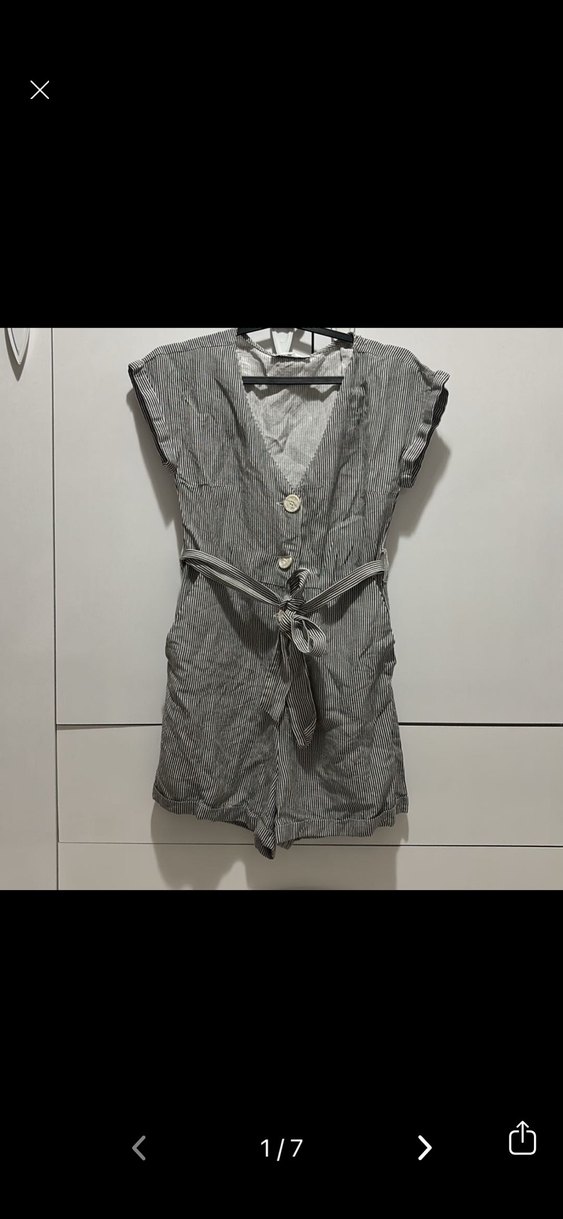 Kolsuz, V yaka ve kemerli gri mini tulum. Nefes alabilen keten kumaştan, günlük sokak stiline uygun minimal ve şık tasarım.