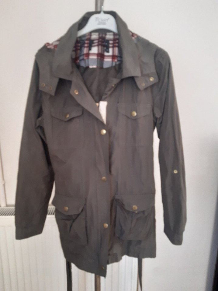 Gri kemerli midi uzunlukta, notched lapel yakalı, uzun kollu, bol kesim kadın ceket. Sentetik kumaştan, rahat sokak stiline uygun.