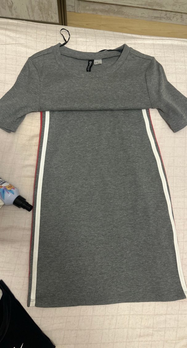 Gri renk, kemerli, kısa kollu ve bisiklet yaka midi elbise. Yumuşak sentetik kumaştan üretilmiştir ve günlük sokak stili için uygundur.
